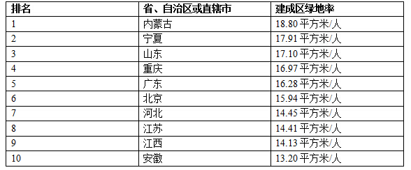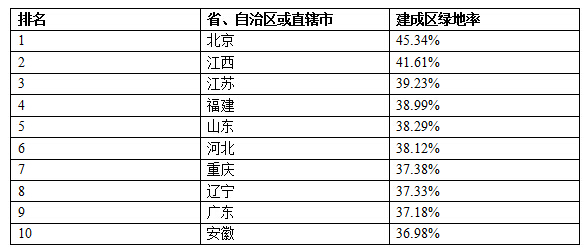 2014年全國各省、直轄市、自治區建成區綠地率前十名排行榜