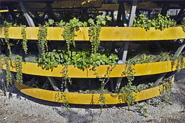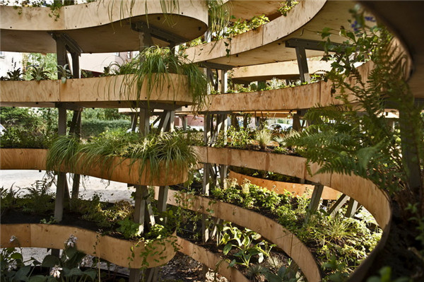 該裝置主要由膠合板和鋼鐵制造,總共設有7層,形成了110平方米的種植區域,種植了有100多個品種、3000多株植物。
