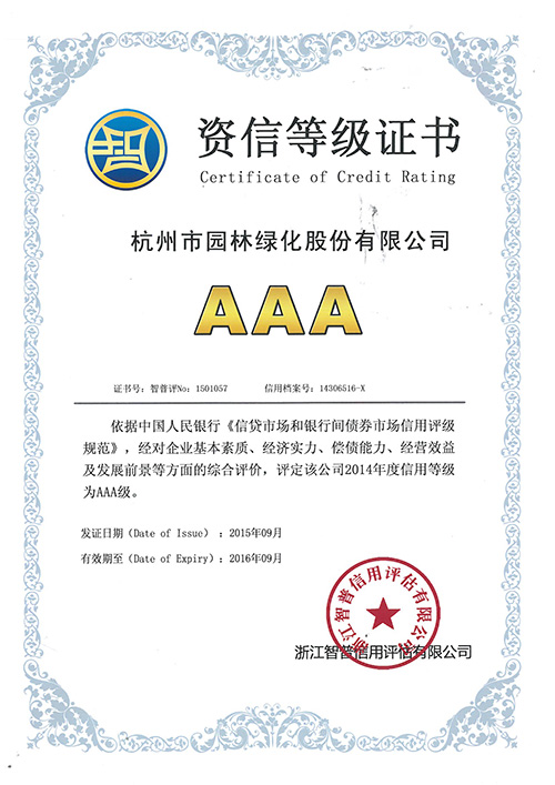 近日,經過嚴格評審,杭州市園林綠化股份有限公司被授予“二〇一五年AAA信用等級企業”榮譽稱號。從2000年起,杭州園林已連續十五年獲得“AAA信用等級企業”稱號,也是園林行業信用等級最高、連續獲得“AAA信用等級企業”時間最長的企業之一。
