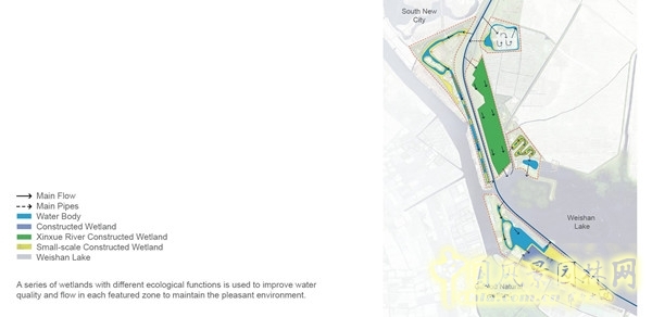 微山湖國家濕地公園集水體修復、濕地保護和旅游等功能為一體,開辟了大型綠地開發的全新模式。作為亞洲最大的湖泊濕地,這塊場地常年飽受過度頻繁的農業和水產業活動的威脅。因此,濕地公園設計的一大目標就是恢復水體質量、保護地域性重要濕地的環境。公園的建立使得這片偏遠的濕地變身成為了一個重要的科學教育基地和生態旅游區,在保證“南水北調”工程中水質的同時,也為當地的經濟帶來了良好的發展契機。