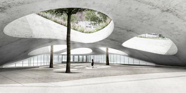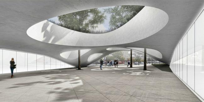 類似地,屋頂上開的一個(gè)個(gè)孔洞也基于多重目的。它們讓地鐵站的外觀更獨(dú)特;陽(yáng)光灑入,室內(nèi)的車站變得明亮,乘客可以看到、感覺到綠色植物以及自然的氣息。與此同時(shí),它也為車站增加辨識(shí)度,在上面經(jīng)過的行人透過小洞望去,就知道乘客和地鐵正在這綠地下面來(lái)來(lái)往往。