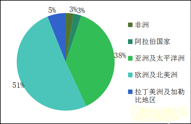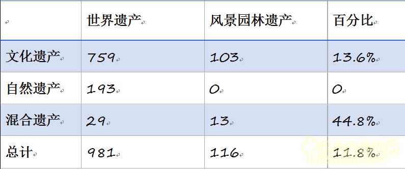 為明確風景園林遺產在世界遺產名錄中的比重和分量,依據上述對風景園林遺產定義的討論,在現有世界遺產名錄中,按五個區域劃分篩選風景園林遺產項目,共有116項遺產地與風景園林直接相關。