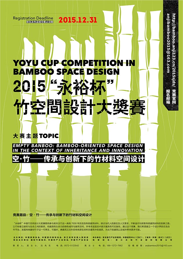 2015“永裕杯”竹空間設計大獎賽,自大賽報名啟動伊始即收到了良好的社會反響,得到了眾多的報名參賽者的支持。經大賽組委會商議,為了給參賽者留出更多的時間完善設計,決定將作品提交截止時間推遲至2015年12月31日,并按以下辦法處理相關工作: