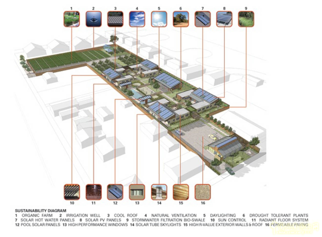 項目可持續性圖解:1.有機農場 2.灌溉井 3.冷屋頂 4.自然通風 5.日光設施 6.耐旱植物 7.太陽能熱水板 8.太陽能PV板 9.生物洼地 10.陽光控制層 11.地板輻射系統 12.太陽能電池板 13. 高性能窗戶 14.太陽能管天窗 15.R-value性能高的外部墻體和屋頂 16.滲透鋪磚