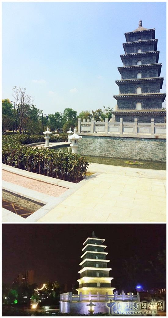 展區的主體景觀為大雁塔微縮景觀造型,采用從施工角度出發,改變外掛石材的傳統做法,采用金屬簡易構架外貼面材的現場施工做法,同時在比例處理上,模型高度不到實際塔高的1/7,為考慮游人視角,按比例縮放的同時,將底部適當加寬,使游人眼中的大雁塔更接近真實感受,既逼真再現雁塔風范,也節省造價、便于施工,是本展園又一亮點。
