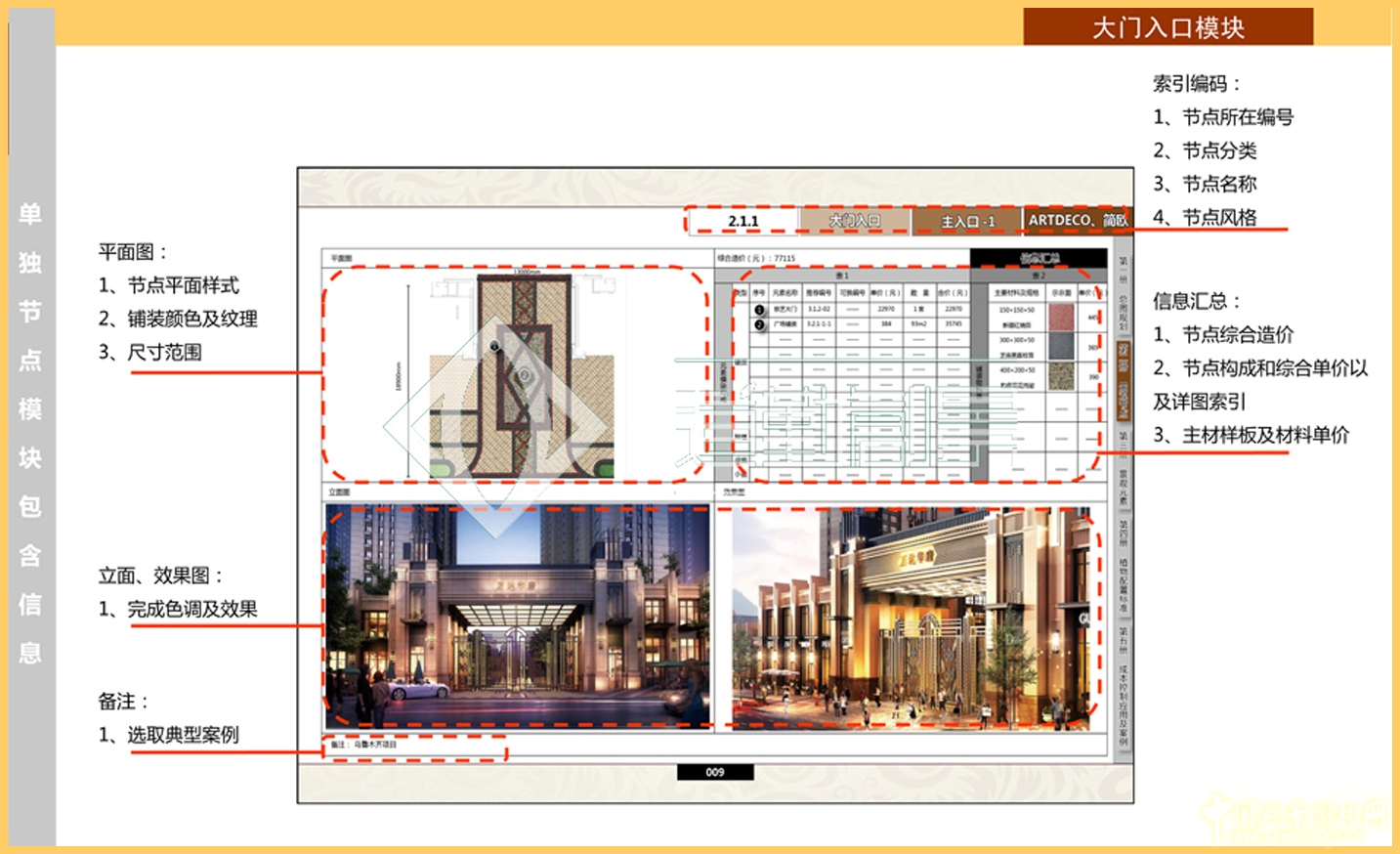 元素模塊內(nèi)容的選擇,除了選取集團(tuán)簽批的定額設(shè)計標(biāo)準(zhǔn)和標(biāo)準(zhǔn)部品外,還對外部優(yōu)秀設(shè)計進(jìn)行選擇,補(bǔ)充和完善元素模塊圖庫,方便設(shè)計選擇和成本控制。