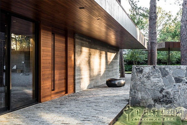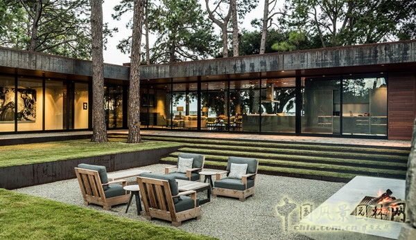 和諧的建筑結構與景觀清秀而自然,仿佛天然而生。該規劃設計將街道與雪松湖串聯為一體,并在茂密的火炬松和槲樹下方安置了包括住宅、涼亭、網球場、大型車庫等在內的建筑。