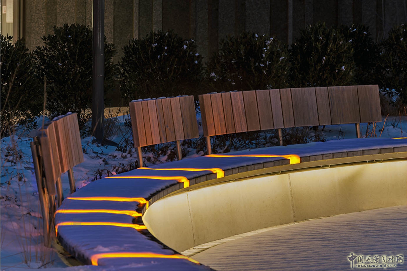 設計注重學生體驗冬天和夜晚的美景,包括燈光、雕塑形態和常青樹的種植。