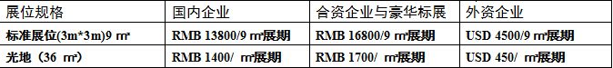 ◆標準展位費用:包括展出場地、2.5m高壁板、楣牌制作、9平方米地毯、洽談桌一張、椅子二把、10A/220V單相插座一個,射燈二支。