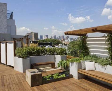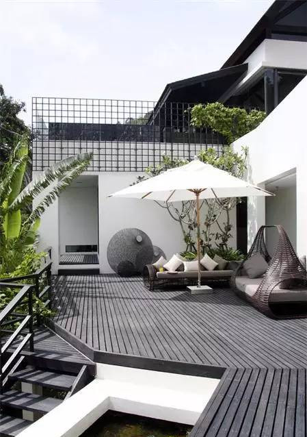 屋頂花園基本上很少設置頂部遮蔽處,作為人們的休憩之地,若是遇到陰雨天或者陽光強烈之時,屋頂花園則避無可避。所以在屋頂花園設計之中總少不了對于遮蔽場所的設置。在一些屋頂花園設置中,常常以延伸出木質屋檐,作為屋頂花園的遮蔽場所。在屋檐之下,增設臺階,以木鋪設,形成與屋頂花園即分離又融合的景觀。若是無需如此強烈的設計感,那么也可以在屋頂庭院設置一處獨立處,搭設大陽傘作為休憩遮蔽處。