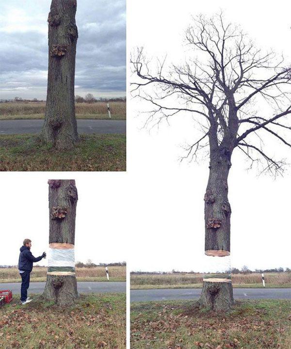 第六、無形的樹,美術設計創造了橫穿樹干中部的德國鄉村景觀,給人一種樹被砍斷的幻覺。只是簡單的在樹上包裹塑料布、噴繪背景景觀,再加上兩分的樹干就獲得了這種效果。