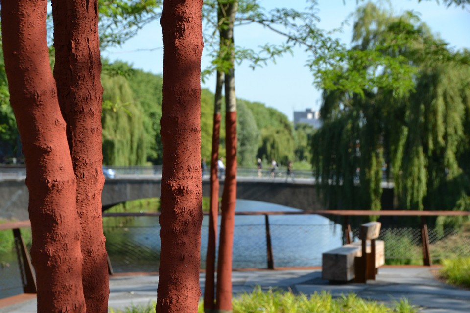 景觀和紅色的耐候鋼(銹蝕鋼板)形成了鮮明的對比