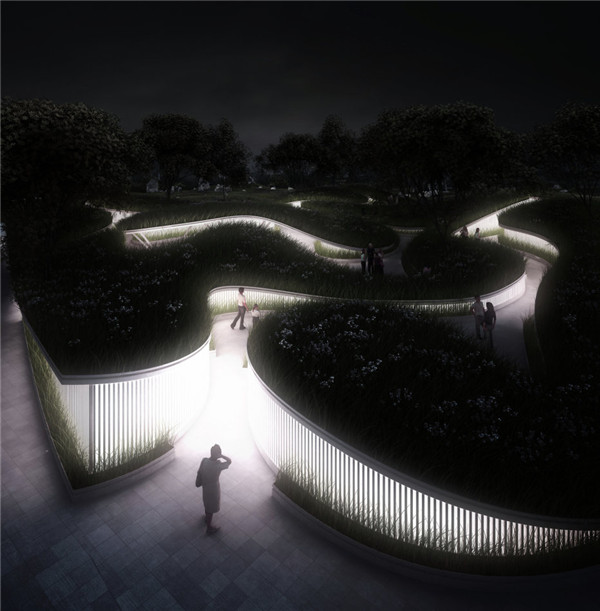 景觀設(shè)計的初衷便源于純粹現(xiàn)象學(xué)的空間體驗,營造一種敏銳幽微而詩意的氛圍。從遠(yuǎn)處看不到植物,而是一片虛渺輕盈的紗質(zhì)帷幕,日光下呈現(xiàn)差異微妙豐富的白色,綠意從半透明的中心隱約透出;夜間燈光下則映射一片樹影婆娑。探索之旅從進(jìn)入武漢園博園園地的一刻開始。白紗錯落間引導(dǎo)中心植物群的方向,無數(shù)可能的平行路徑帶來的不確定性創(chuàng)造偶遇的驚奇。植物和紗質(zhì)帷幕逐漸增加空間密度和高度,光線緩慢變暗,漸入秘境,接受植物圍抱的過程成為沈靜心靈的洗禮。