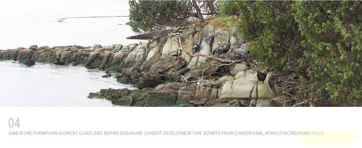 砂石地層沿著B(niǎo)C海岸線激發(fā)了設(shè)計(jì)靈感,拋棄傳統(tǒng)的觀念,設(shè)計(jì)了整體式的擋土墻。