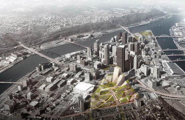BIG與West8以及AtelierTen聯手在匹茲堡下丘區一塊28英畝的用地上打造了一個跨越場地地形的無障礙城市規劃區,這個區域包含了1200個住房單位,一萬平方米的商業區,以及一個充滿活力的城市開放空間。這次規劃乃是對10年前規劃的重新調整和開發,新增的公共區域能夠極好的聯系各個區域和城市。