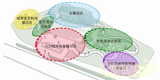 園區由入口城市形象展區、生態濕地展區、主展館區和生態科技展區、哈爾濱地帶性樾的栽植區五個部分組成,其中,城市形象展示區利用哈爾濱最具代表性的建筑、建設材料來展示哈爾濱獨有的城市風采;生態濕地區則是通過環境來塑造生態的哈爾濱環境;主展館區利用浮冰造型的建筑形式通過視和觸覺向參觀者傳遞一個不一樣的哈爾濱;城市生態科技展示區通過丁香花瓣的造型結合用聲、光、電等科技手段,展示科技哈爾濱的未來;哈爾濱地帶性植物栽植區是利用哈爾濱的常用的植物品種來展現哈爾濱的園林特色。