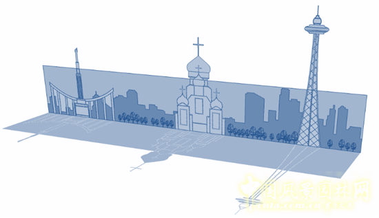 影壁墻選用具有哈爾濱代表性的建筑——防洪紀念塔、索菲亞教堂、龍塔做主題,形成哈爾濱的簡影,設計材料選擇淡藍色有機玻璃,采用透明、半透明,孔洞組合等方式組合而成,利用光影的效果,將主體建筑投射到地面,形成虛實相映的入口空間。