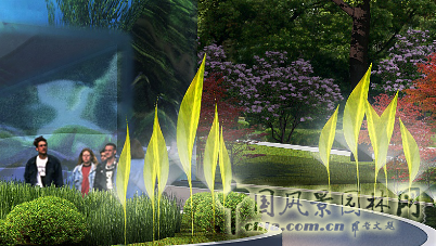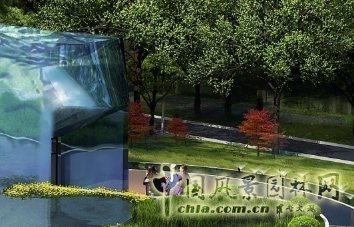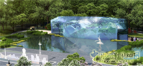 建筑入口采用下沉的空間環境,使主體建筑下臥地面2m,設計在追求空間變化的時間,為節約能源,創造涼爽的建筑內部環境提供保障。建筑入口一側采用鋼化玻璃做為水池邊,上面有“冰花”的浮雕圖案。入口兩側由蘆葦葉抽象的噴霧裝置,使人們在未進入主體建筑時就感受到一絲絲涼意!