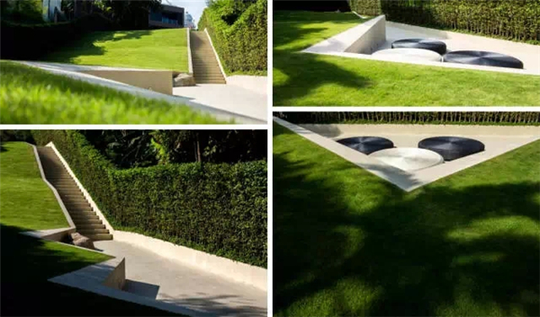 該場地有兩種不同的地形特征,大面積的區域位于小山丘頂部,較為平坦,海拔約12米;另一部分是一個狹長陡峭的筒狀空間,將平坦的區域和海灘連接在一起。因此,該場地被分為兩部分:“暫停庭院”(Pause Court)和“山丘草坪”(The Lawn Hill)。