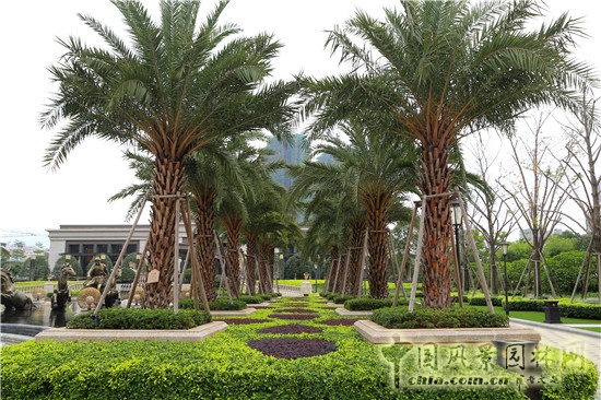 為了帶給人開敞明媚的空間感覺,設(shè)計師采用法式園林中軸對稱的手法,打造出氣勢磅礴的中央水景,軸線上布置雕塑、花壇、噴泉、園燈以及陣列整齊的銀海棗,精致的細(xì)節(jié)給人以強烈的精神感染。設(shè)計中力求通過景觀軸線帶來一種遞進(jìn)式的美感,將景觀一層一層地呈現(xiàn)在賓客眼前,通過簡單幾何元素的重復(fù),形成有節(jié)奏的韻律感,達(dá)到豐富的景觀效果。