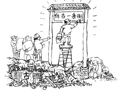 然后是動遷,將原住民統統請出去,易地安置。原住民是老街的主人,也是老街的靈魂,他們身上保留著老街代代相傳的記憶與情感。把他們請出去,老街還剩下什么?只剩下街名,街名能成為旅游的賣點。因此,如今各地的仿古街除去街名,其他基本是一個模樣。就像當年造新城那樣,彼此抄襲,結果千城一面;如今造仿古街還是彼此模仿,結果也一定是千街一面。