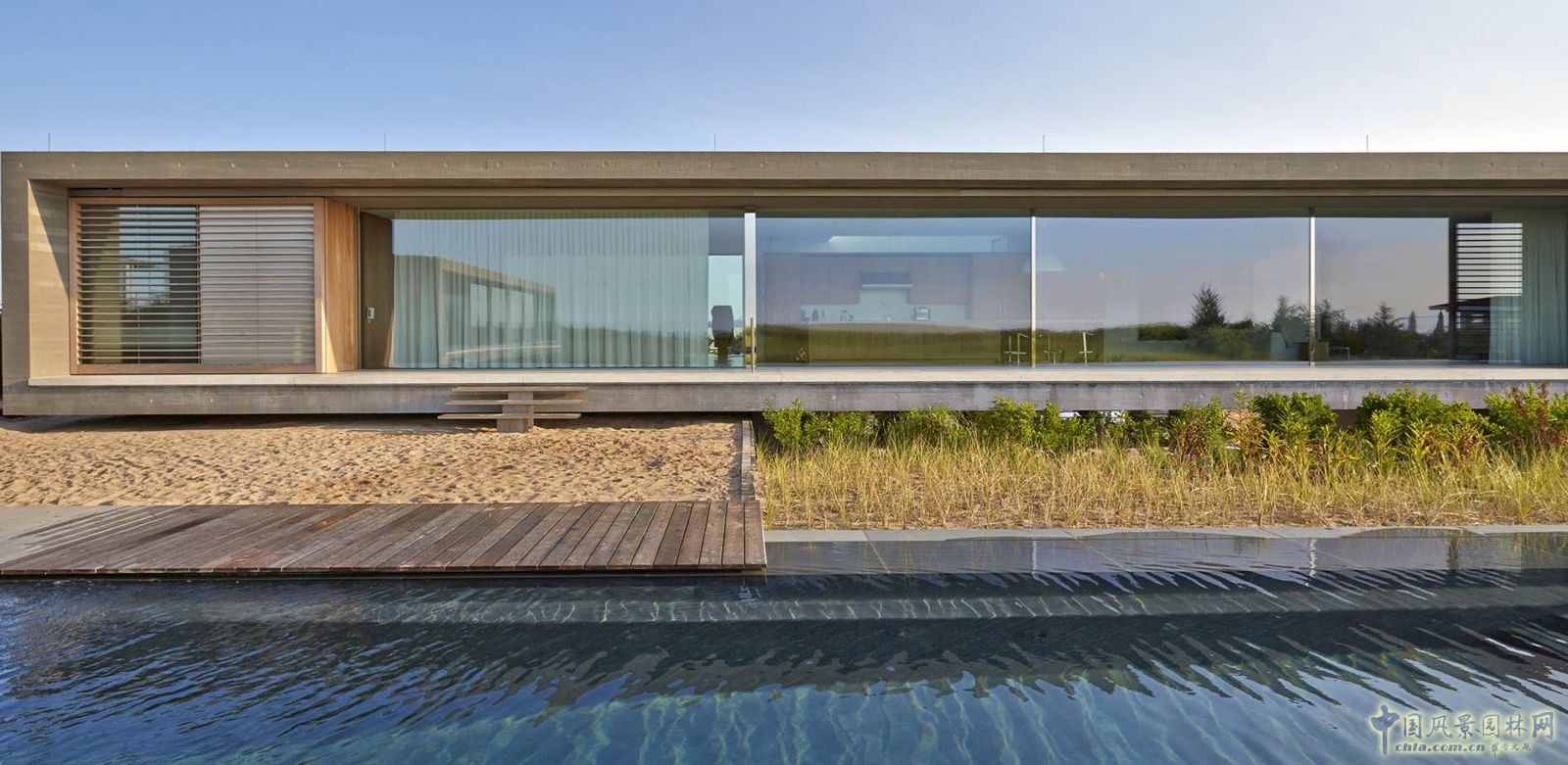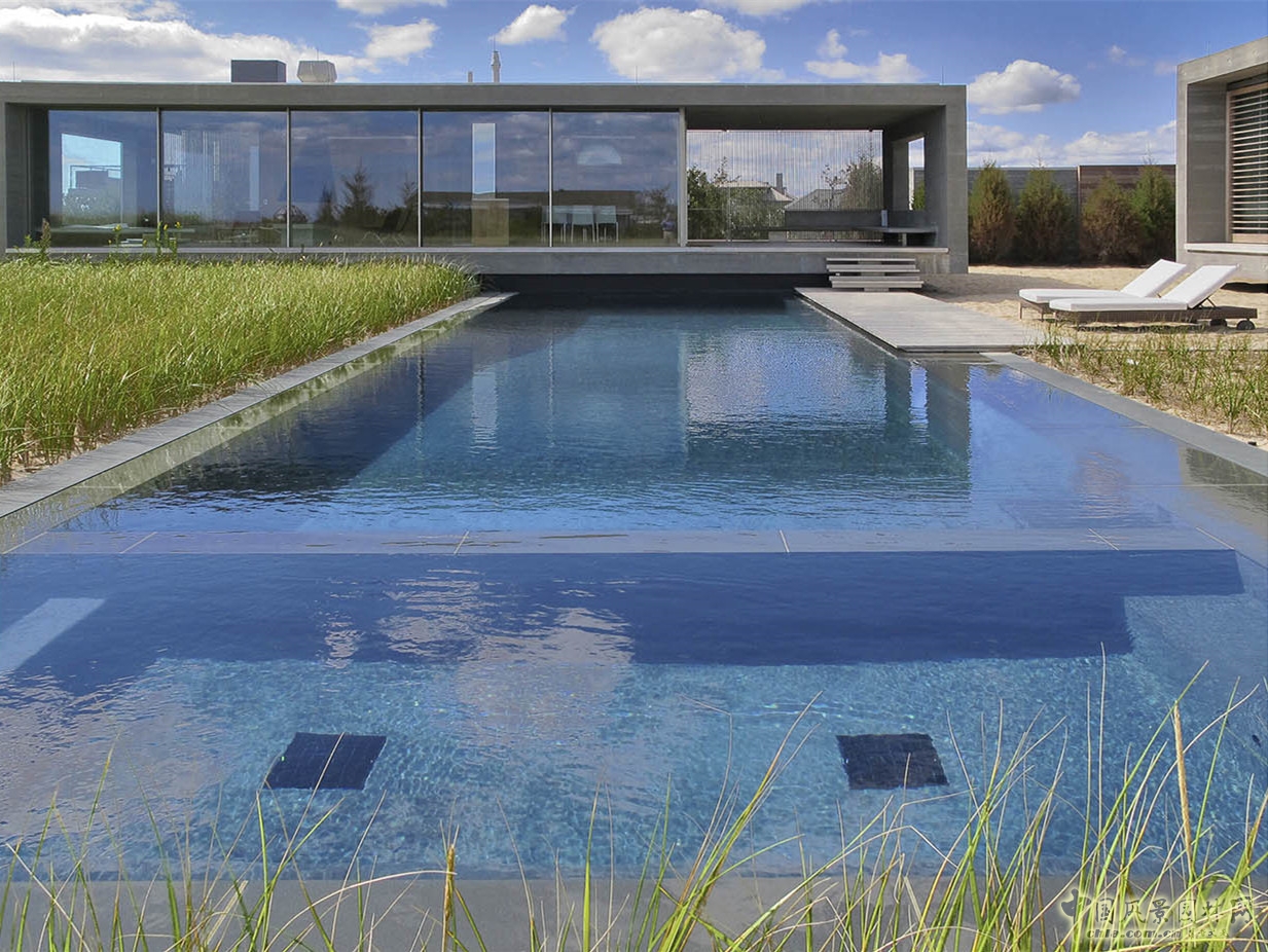 木質(zhì)甲板輕輕懸浮在泳池的邊緣。一個簡單平坦的沙灘可供人們悠閑漫步或是放置沙灘椅,躺在上線休憩,營造出一種仿佛在海邊度假的感覺。