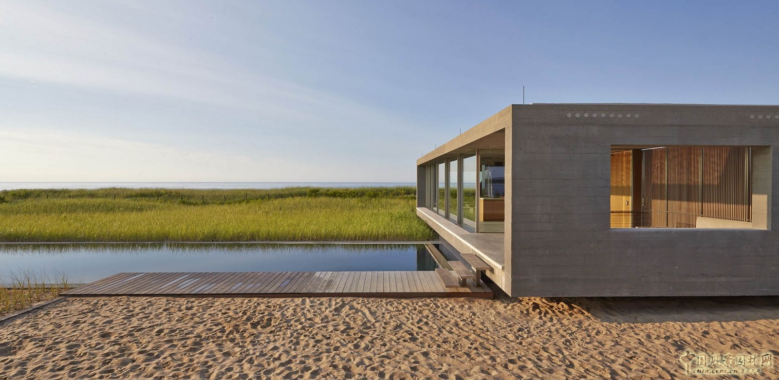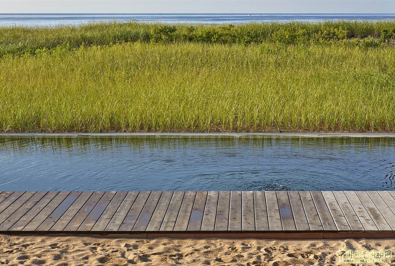 從遠(yuǎn)處望向這處景觀,泳池幾乎不可見,隱沒在成片的沙地植物中。