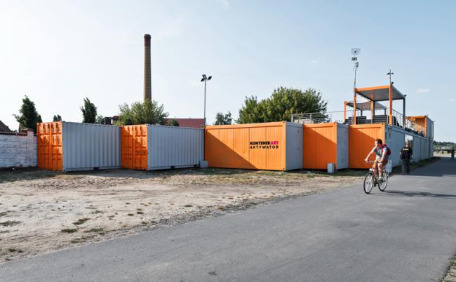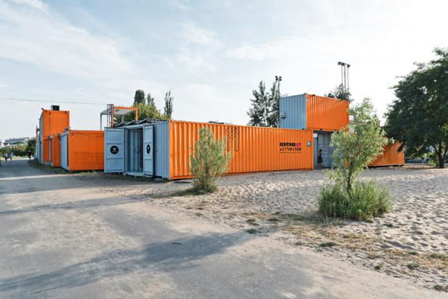 集裝箱安置到規定位置后,它們的南北外表面被涂上明亮的橙色,顏色鮮明出挑并標志入口處。內部區域地面鋪滿沙子,構造出一片配有折疊躺椅的海灘,此外還有由不同高度的黑箱子堆積成的小島,而且所有的箱子環繞著一棵樹,形成是整個建筑群的中心區域。