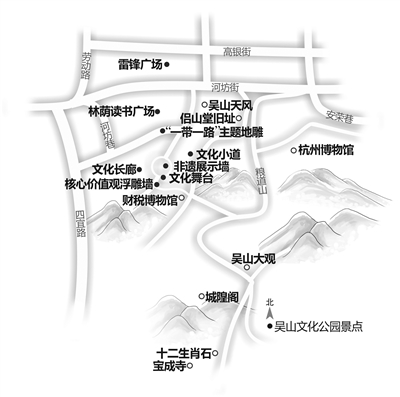 1.5萬平方米的吳山文化公園有8大看點(diǎn):雷鋒廣場(chǎng)、林蔭讀書廣場(chǎng)、“一帶一路”主題地雕、文化長廊、文化大舞臺(tái)、非遺展示墻、核心價(jià)值觀浮雕墻、文化小道。