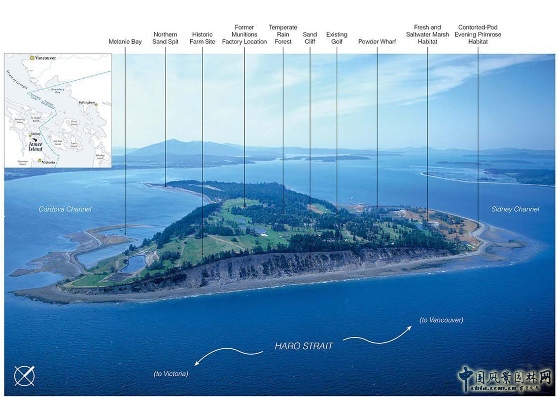 選址規劃。詹姆斯島嶼的沙崖位于不列顛哥倫比亞省維多利亞附近的哈羅海峽外。這個846英畝的小島通過廣泛的環境整治、周到的土地利用規劃和堅定不移地保護理念,使這座島嶼被免于毀滅。