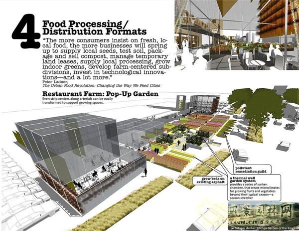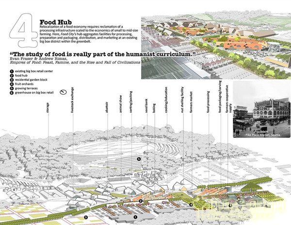 4. 食物生產與分配-食物中心。隨著居民對新鮮、原產食物需求的增長,城市對于生產設備的要求也就越苛刻。食物中心聚集了各類食品生產、包裝、運輸及銷售的設備。