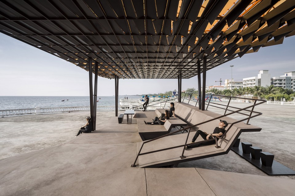建筑師將地面折疊,面朝大海,人們可以在不同的地面層次坐下來放松和享受,同時(shí)因?yàn)榈孛娓叨鹊暮侠碓O(shè)置,還不會(huì)擋住亭子后面人的視野。金色折疊亭可以支持小型演唱會(huì),會(huì)議,小型體育看臺(tái)等功能,也是休閑放松聚會(huì)發(fā)呆看風(fēng)景吃零食的好去處!