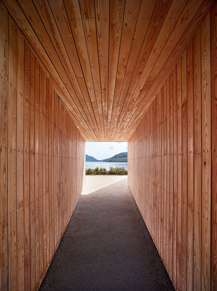 朝向湖泊走時(shí),觀景臺看起來十分瘦長,門和通道甚至也和那條斜坡上的路一樣狹窄。但從背面看,那扇小小的門就像照相機(jī)的鏡頭,透過它看到的湖景,與整個(gè)全景(天空、湖面、山脈、林木)形成有趣的對比和呼應(yīng)。