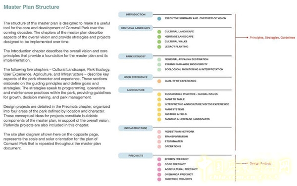 這是景觀設(shè)計(jì)師完成的指導(dǎo)新西蘭最有價(jià)值的城市公共空間之一——康沃爾公園百年發(fā)展的總體規(guī)劃。它的設(shè)計(jì)基于長(zhǎng)時(shí)空跨度的思考,權(quán)衡了3個(gè)重要的元素:毛利人的文化景觀、早期定居者和創(chuàng)始人的愿景、新西蘭農(nóng)業(yè)景觀和項(xiàng)目地生態(tài)價(jià)值。總體規(guī)劃也兼顧了公園項(xiàng)目、基礎(chǔ)配套設(shè)施建設(shè)。由此產(chǎn)生的規(guī)劃增強(qiáng)了公園維持健康的城市生態(tài)的能力,將在未來(lái)百年內(nèi)給不同年齡的游客帶來(lái)啟迪和快樂(lè)。