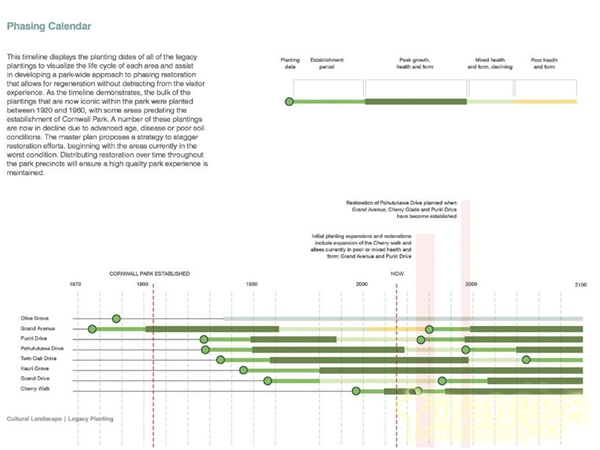 總體規(guī)劃闡述了如何將公園建造得特色鮮明,融入了21世紀(jì)公共公園服務(wù)于多樣化的、日益增長(zhǎng)的人口的公園建設(shè)經(jīng)驗(yàn);提出下個(gè)時(shí)代的公園以典型的步道為特征,擴(kuò)大了區(qū)域和公園地帶的連通性,把公園中心的停車場(chǎng)遷移到周邊區(qū)域;提供了重新設(shè)計(jì)道路網(wǎng)的機(jī)會(huì);提高公園步行可達(dá)性、連通性、娛樂(lè)性;同時(shí)創(chuàng)造新的聚會(huì)、運(yùn)動(dòng)和舉辦活動(dòng)的空間。遵照改善設(shè)施、種植和規(guī)劃的建議,現(xiàn)有的公園空間被整合得更適應(yīng)日益更新的規(guī)劃框架。總體規(guī)劃基于與康沃爾公園管理者、員工合作設(shè)定的發(fā)展原則的指導(dǎo),多樣的規(guī)劃顧問(wèn)團(tuán)隊(duì)由毛利人領(lǐng)導(dǎo)、當(dāng)?shù)剡\(yùn)輸計(jì)劃、生態(tài)、考古、歷史、工程、服務(wù)行業(yè)的專家組成。