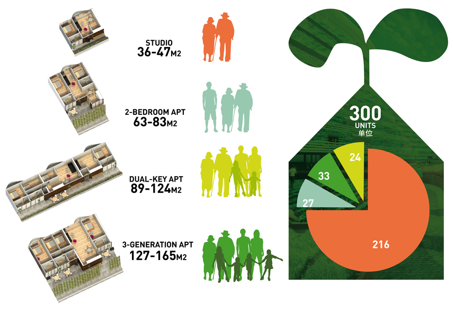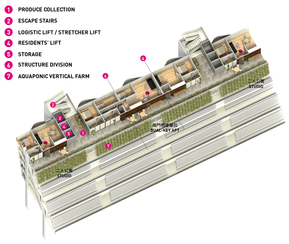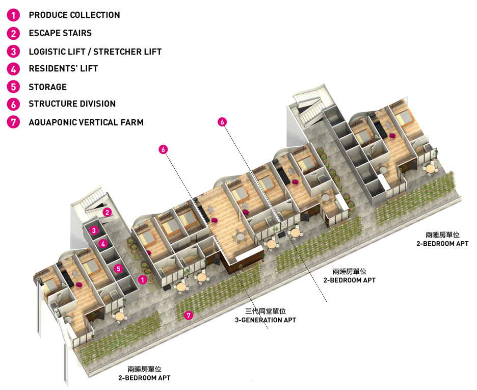 這些家庭單元將被設(shè)置在錯列曲線樓群的不同位置,并圍繞著農(nóng)場區(qū)域以提供給居民觀察植物生長的機(jī)會。