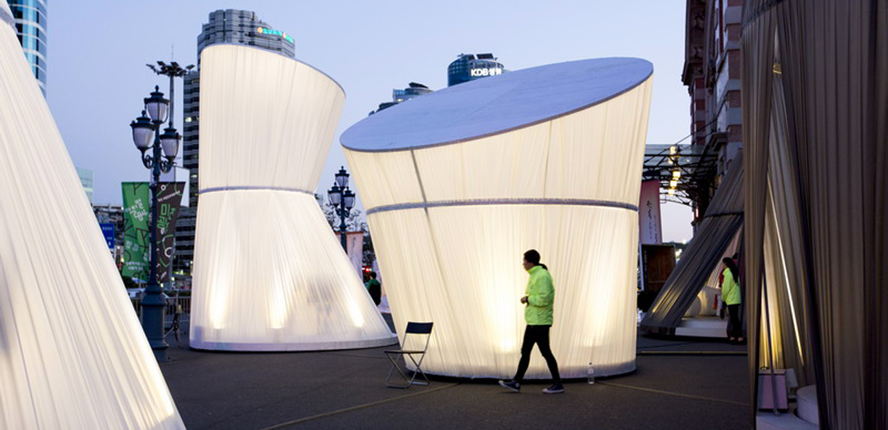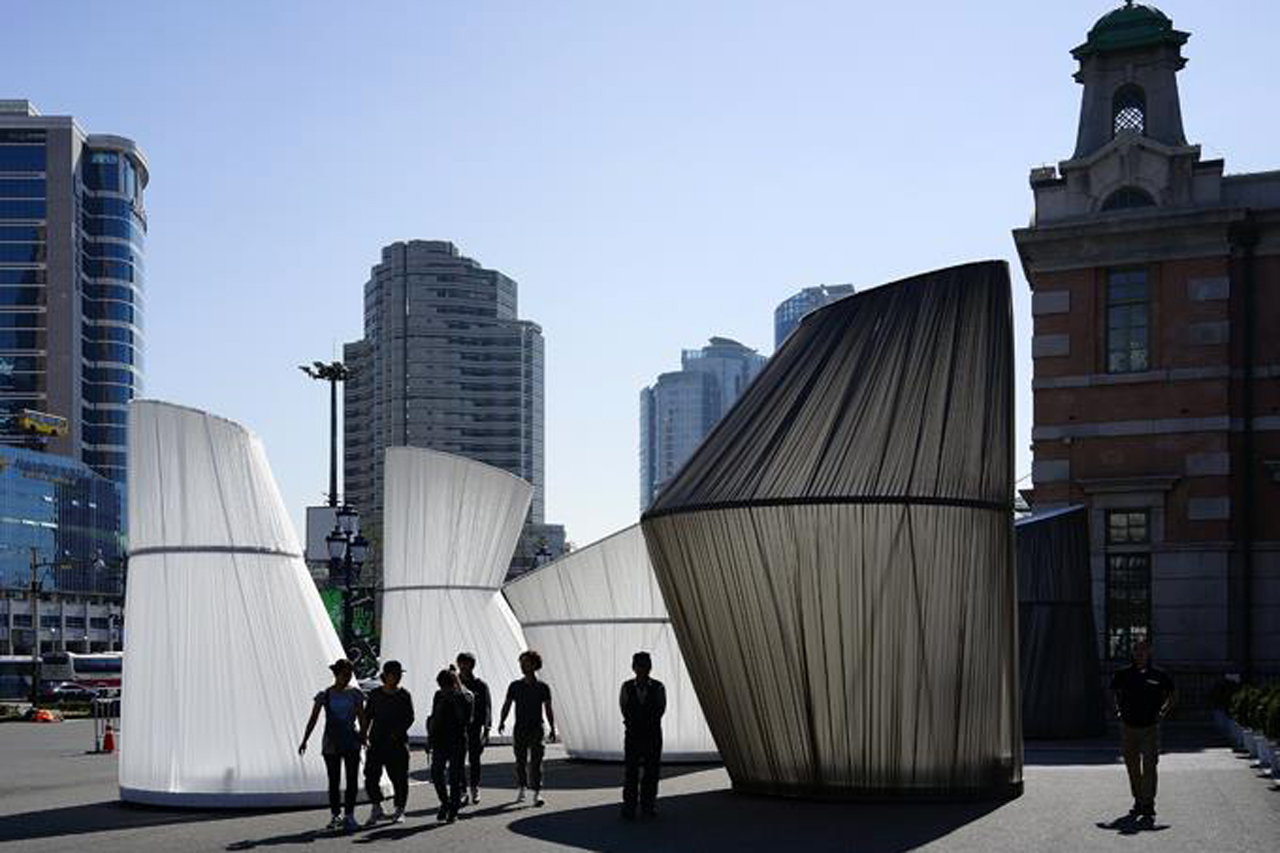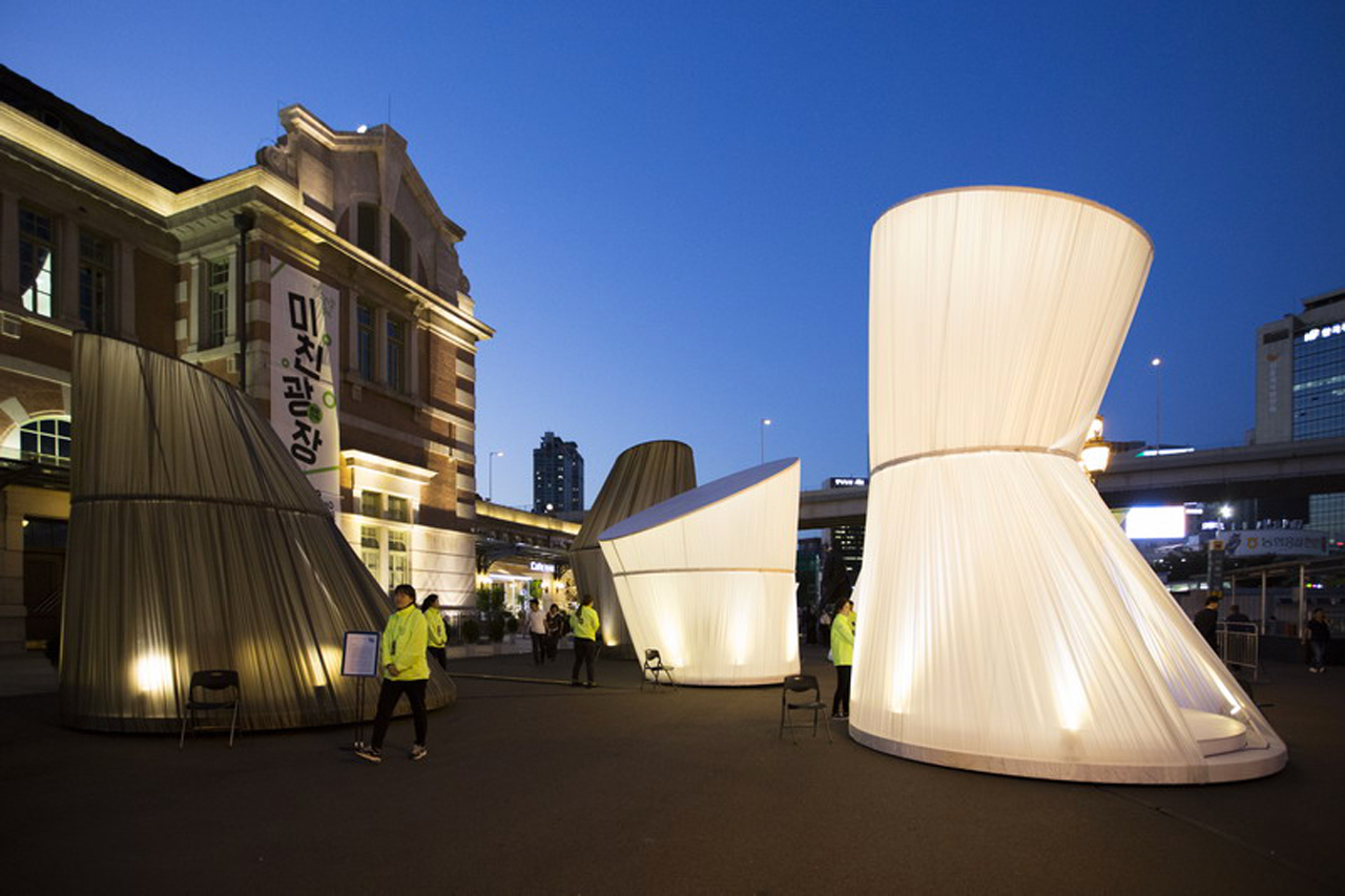 兩名韓國設計師Sang Hoon Youm 和Yoo Jung Lee最近在首爾火車站前搭建了一系列可旋轉(zhuǎn)的裝置并命名為“Dancing Forest(舞動的森林)”,希望以此能改善人與人、人與藝術、人與時間、人與城市之間的關系。