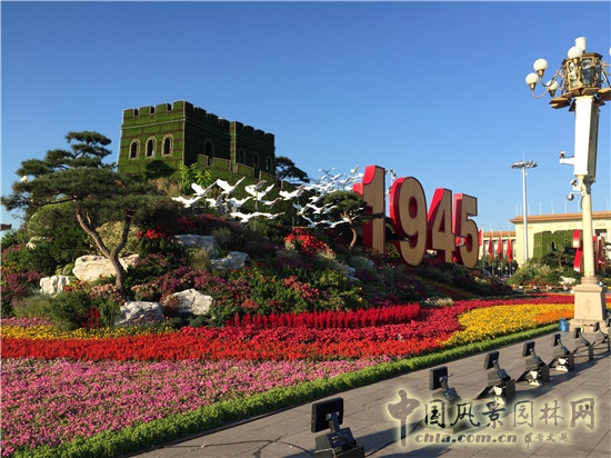 為迎接9月3日舉行的“中國(guó)人民抗日戰(zhàn)爭(zhēng)暨世界反法西斯戰(zhàn)爭(zhēng)勝利70周年”紀(jì)念活動(dòng),在天安門廣場(chǎng)及長(zhǎng)安街進(jìn)行了以“銘記歷史,緬懷先烈,珍視和平,開創(chuàng)未來(lái)”為主題的花卉布置。其中在天安門廣場(chǎng)布置兩組以“長(zhǎng)城”為主題的大型花壇,在長(zhǎng)安街的東單、西單路口分別布置8組主題花壇,在長(zhǎng)安街沿線還布置有地栽花卉。