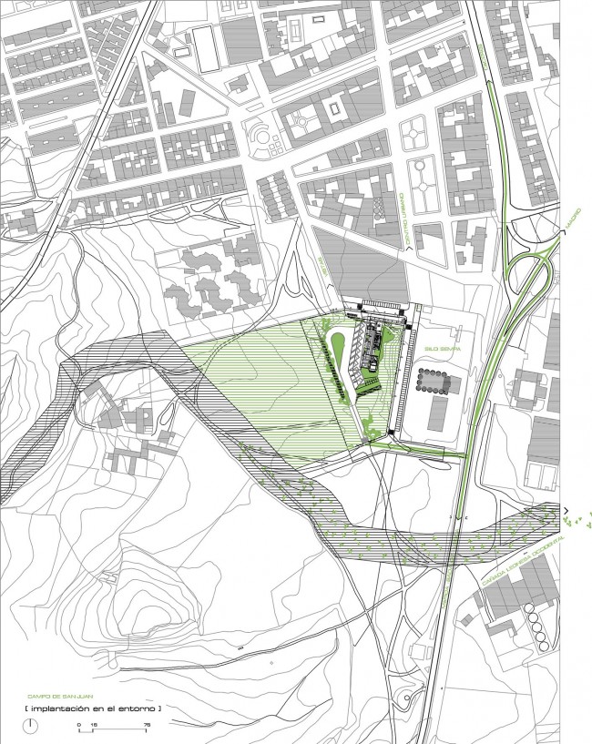 沿著進城方向的公路,巖石構成的自然景觀逐漸被人工打造的天際線所取代。Trujillo公共汽車站正是位于這一城鄉交界處的廣闊地帶。城市規劃部門試圖通過一塊畜牧區和綠地將這一區域和城市整合在一起。Trujillo巴士站以其低矮的、如同一塊巖石造型成為城鄉間的過渡,為過往的乘客提供庇護。