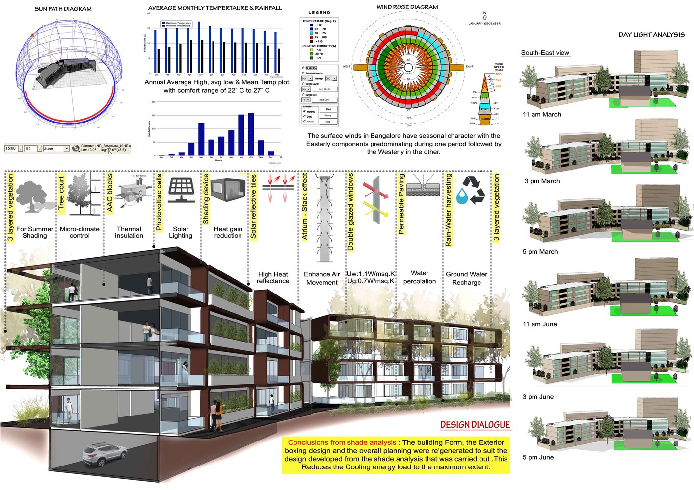 一個綜合的設計方法要通過評估并且盡可能最大化的實現建筑節能。太陽能研究與模擬被用來生成關于采光、陰影分析、降雨方式和遮陽系統的數據。這些研究,連同日照分析一起,都對荷載計算、定型和挑選機械系統方面有著至關重要的作用。