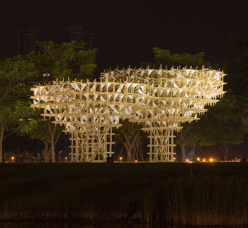 所選的展館名為“三胞樹”(Treeplets),此為一個臨時的竹制結(jié)構(gòu),試圖解決公民和城市景觀之間的規(guī)則問題。設(shè)計師認(rèn)為,城市密度并不意味著生活在一個混凝土構(gòu)成的冷酷的環(huán)境中。他們深信,需要教育、宣傳和培養(yǎng)激發(fā)城市風(fēng)格的其他形式,以此在公共空間的自身特點內(nèi)發(fā)揮可能的作用。