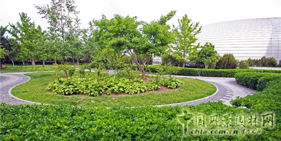 大劇院南區(qū)結(jié)合地上構(gòu)筑物的間隙設(shè)計微型花園,植物品種增加了玉蘭、紫薇、玉簪等觀賞植物。同時配合古銀杏,栽植一些觀葉植物,如元寶楓、銀杏等,為北京金秋國慶增添一抹俏麗的色彩。南入口坡地大葉黃楊造型施工難度較大。