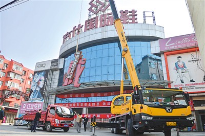 圖為工人在拆除北京豐臺大紅門地區的方仕國際鞋城的標志。