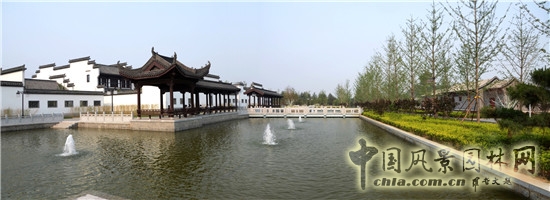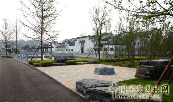 園博古民居文化展示區北坡地塊用地不夠理想,地勢平坦,穿過園區的高壓線將用地分為南北兩塊,主體部分在南側,這塊地南面面山,東面臨河,南部空間局促。這里適合布置呈胡同式組合的普通民居四合院。通過地形的整理,創造西、北部高,南部有狹長水面的地形骨架,創造一種接近理想的、山水相融的居住環境。地塊北側布置地道的北京四合院和胡同,經過一定的綠化環境的過渡,中部是徽派民居,臨水而居是徽派民居的一大特點,所以在中部設計了一條河道一樣的水系,南部是臨水北京四合院。這樣的布局展示了北國江南的生動形象,同時,水系的環繞,黑白灰色調的協調,將南北兩大派系的建筑融合在山水之中。南部的狹長水系,減弱了建筑面山的局促感。北坡整體建筑群相對集中布置,外圍留出更多的園林空間。園林環境以植物為主,營造綠樹環繞、幽靜、而有品味的自然空間。在綠化環境中通過植物、山石、水系等自然元素造景,表達傳統民居的環境特點,創造一種融入自然山水中的民居景觀。