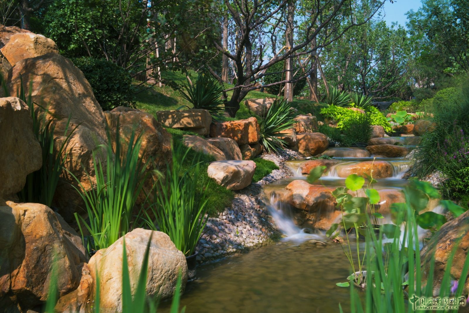 “一帶”龍形水系貫穿園區東西,呼應“龍脈”的歷史背景,同時也是景觀工程中重點打造之處。在仔細研究圖紙的設計意圖之后,從水系景石的布置、到微地形的構造,從每一株探水植物的選型、到潺潺流水的效果,一草一木皆用心,一磚一石都經得起考量。作為現代住宅空間,我司在打造水系景觀之時,植物種植手法融合借鑒的中國古典園林疊山理水之法,利用對景、框景、借景、夾景等方法構成了一組美麗的畫面。