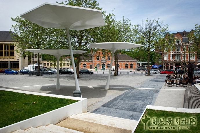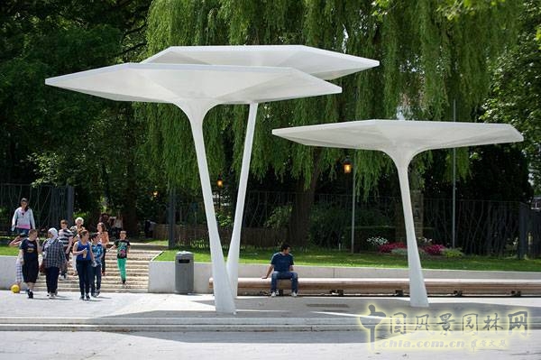 現有的市政公園和廣場形成無縫連接。入口處的標志是寬闊的臺階和白色的六角亭。對比鮮明的色彩和醒目的結構構成了一個非正式的聚會場所或者小型的表演空間。這些亭子不僅美麗,如果將亭子的暴露面與光伏電池相結合,它們就會成為一個吸取能量的裝置。