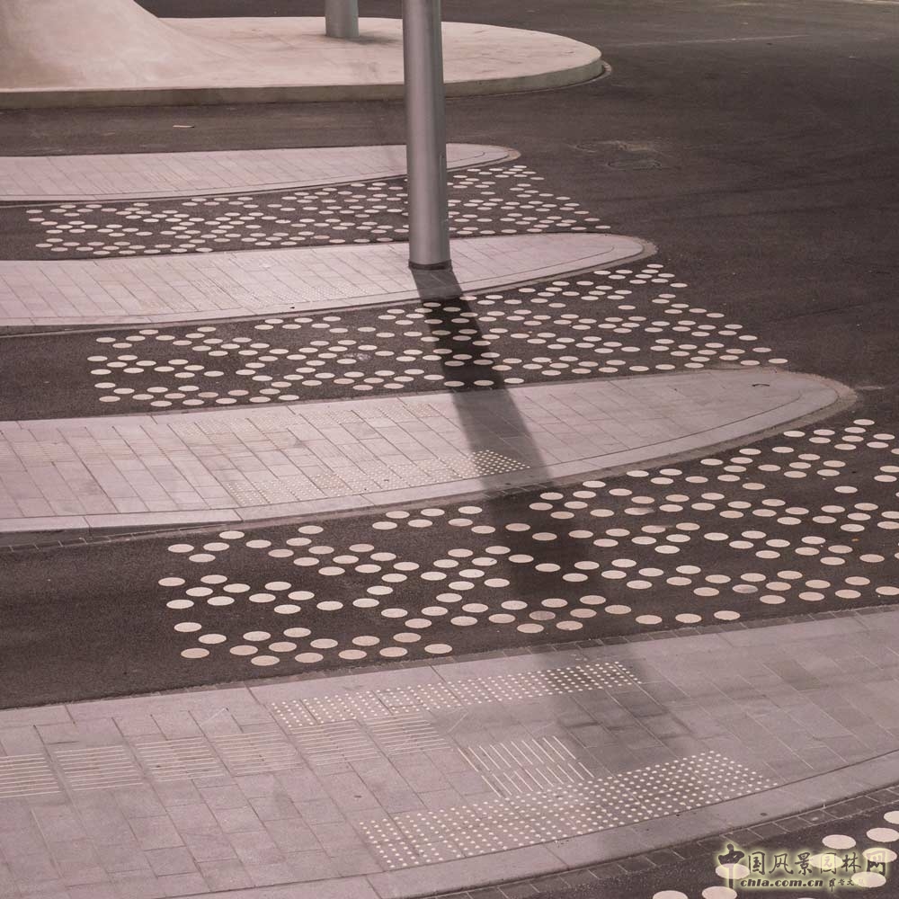 公交樞紐和換乘站的階梯可以直接通到外面的空間區域,場地的空間設置具有連續性。利用石塊鋪設通往四面八方的道路,并利用不銹鋼打造的一些圖形小品,營造空間中起伏變換的地形。對于高差的問題,設計師將石頭疊放進行地形的連接。木質座椅和長凳等都配以綠色植物裝飾,以此提升空間的體驗感和質感。