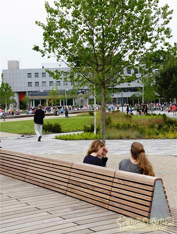 極易辨識的日光休息區(qū)與水景區(qū)共同組成了廣場中最具吸引力的景觀。休息區(qū)由普通的木質(zhì)長椅逐漸延伸,變成了流動的木甲板,在廣場中央為市民提供了充足的享受日光的空間。
