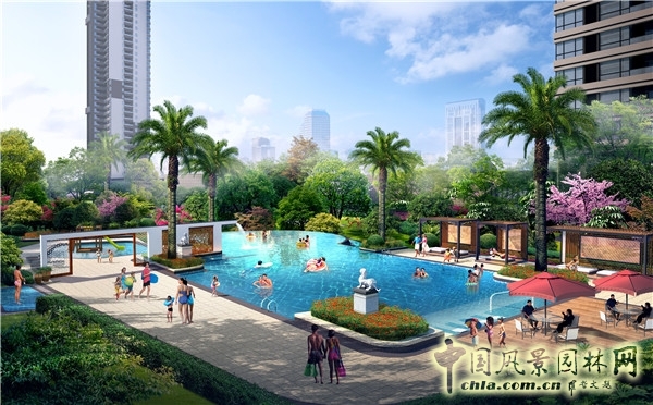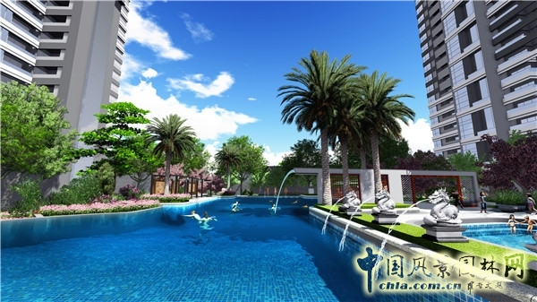 泳池水景是解決景觀多元化的有效元素,我們設計有成人與兒童池、噴水景墻、千秋亭、龍吐珠、御尊麒麟柱和無邊際疊水等。躺在太陽椅上,你會感覺輕松暢快;泳池空間進行抬高處理,下部以輕質材料架空,營造豎向高差,同時解決了承載問題;泳池為半封閉管理模式,方便日后物業營運;健身活動平臺設計有樹枝狀童玩設施、迷你沙坑、飛魚景墻和特色坐凳等室外活動景觀。無邊際疊水概念的引入,可讓泳池使用與觀賞一舉兩得,更能為銷售線路提供一處疊水觀賞面。