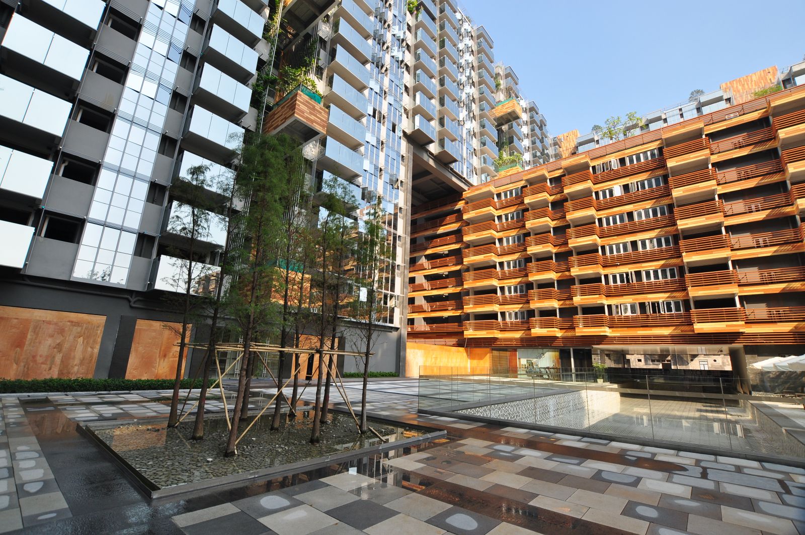 萬科峯境的園林具有豐富的層次,除了地面花園、在商業屋面露臺、高層屋面露臺都有樹木花草覆蓋,并在建筑的每四層設置了觀山平臺。萬科攜手新加坡著名園林設計公司Salad Dressing, 別出心裁的設計了水杉倒影、水墨白錦、水心藍珀、巨型盆栽等景觀和兒童活動虹谷,為業主營造了豐富的活動空間。